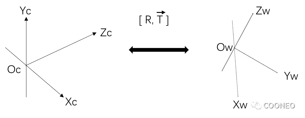 世界坐標(biāo)與相機(jī)坐標(biāo)都是三維坐標(biāo),遵循右手定則且三軸互相垂直。通常通過(guò)旋轉(zhuǎn)和平移的變化(外參矩陣)可以實(shí)現(xiàn)兩個(gè)坐標(biāo)系的轉(zhuǎn)換。