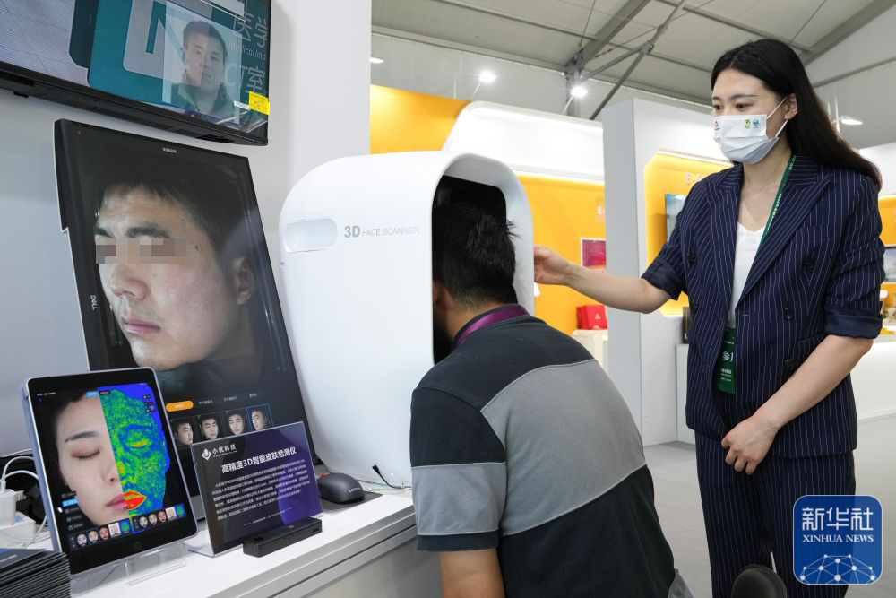 在活動(dòng)現(xiàn)場人民網(wǎng)記者(趙越、王銳)對(duì)小優(yōu)智能科技商務(wù)總監(jiān)韓曉菲進(jìn)行現(xiàn)場采訪,并現(xiàn)場體驗(yàn)了小優(yōu)智能科技高精度3D人臉皮膚檢測儀。