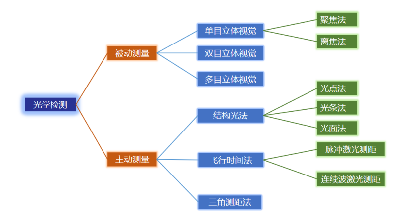 光學(xué)測量分為兩種測距法,一種是主動,一種是被動。主動測距方法是需要用特定的、人主動去控制光源以及聲源,對被測物體進行照射,我們依據(jù)物體的表面反射特性、光學(xué)和聲學(xué)特性來獲得被測物體的三維信息。主動測距方法主要分為三種:(1)結(jié)構(gòu)光法(2)三角測距法(3)飛行時間法;被動測距方法主要為雙目立體視覺測量。